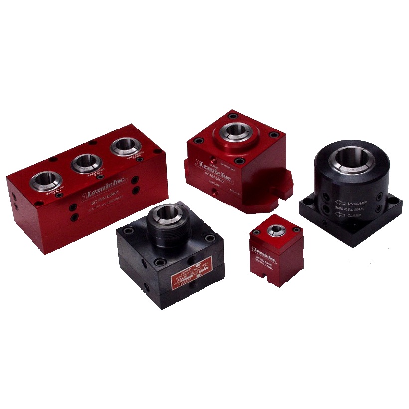 Porta-pinça pneumáticos e porta-pinça hidráulico estacionários, foram desenvolvidos para aplicações onde seja necessário prender com segurança e rapidez, materiais de secções redondas, hexagonais ou quadradas. Utilizam pinças tipo 5C com ação pull-back, que significa que a pinça (que agarra a peça ou ferramenta) é, literalmente, “puxada para baixo”.